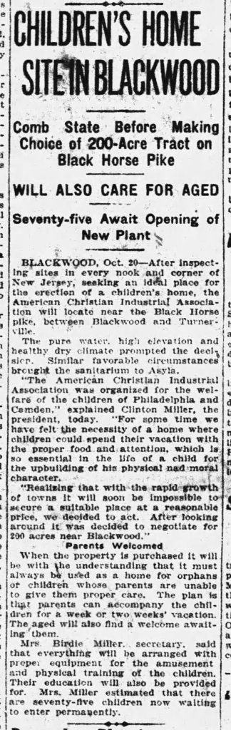 Recently uncovered news articles show that Birdie was involved in the scheme, unable to tear herself from Clinton’s charms during his imprisonment. There is no evidence the land was ever purchased, or the vacation center ever built. The couple is featured in October of 1925 in the Camden Courier Post, discussing the 200 acres they plan to purchase and the camp they intend to build for orphans and needy children and elderly, to provide education and “build physical and moral character.” In 1933 the American Christian Industrial Association, Inc. had their charter to operate repealed by the state for failure to pay taxes. There is no evidence it ever opened or operated.