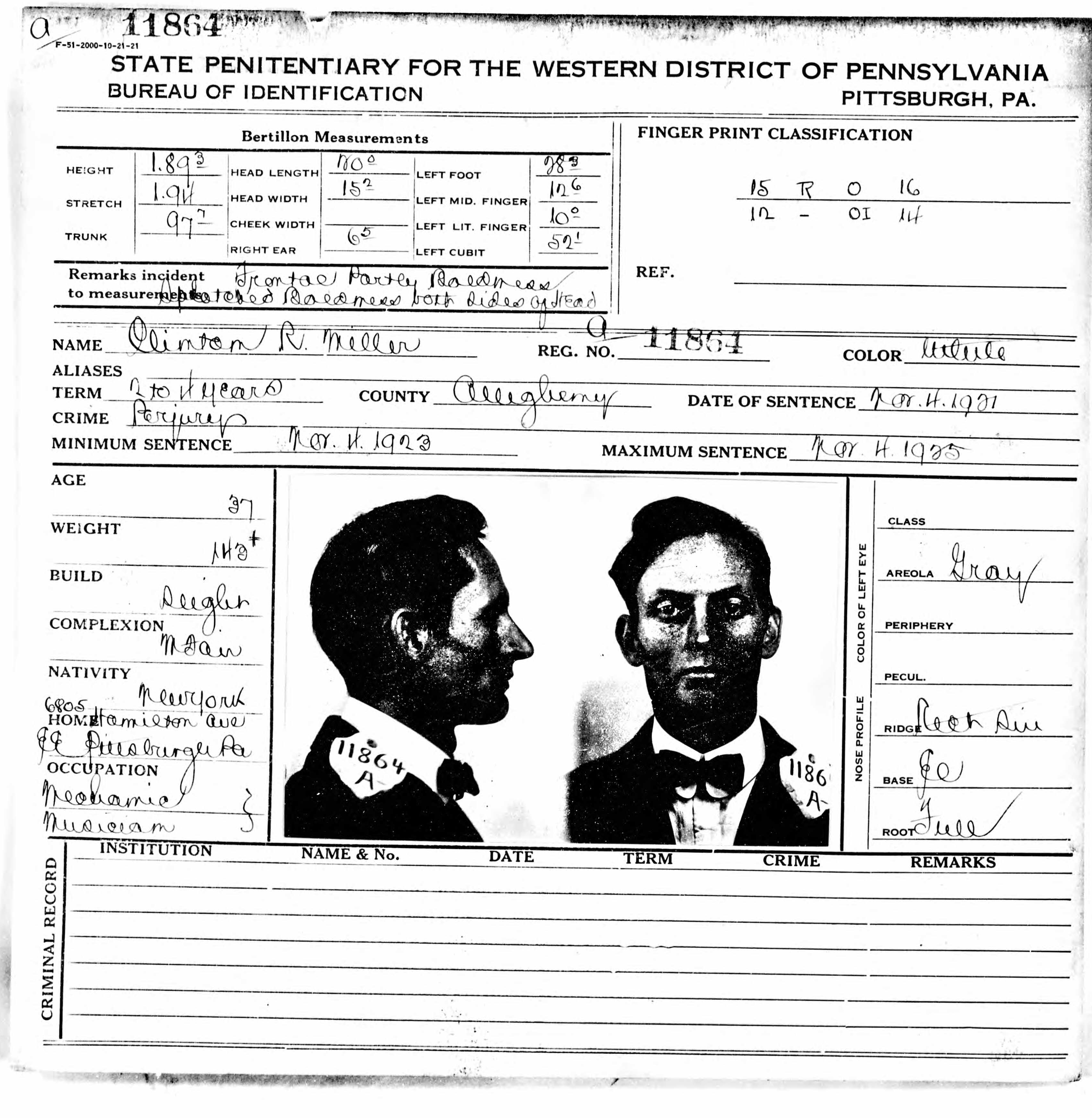 Clinton arrived at the prison in Alleghany at 37 years old, for his sentence of 2-4 years. His crime was listed as perjury, although newspapers indicate he had pled guilty to bigamy charges as well. He was 6 feet tall, 143 pounds, of sleight build, with a medium/fair complexion, black/gray hair and gray eyes. He had a tattoo of his initials – “C.R.M” – and the words “Born 1884” on the back of his left shoulder, and several scars, one running along the side of his face above his nose. He listed an occupation of Mechanic/Musician. He claims to be a regular drinker, married and without any living children – so he lied to the government even as he entered prison for the crime of perjury.[9]