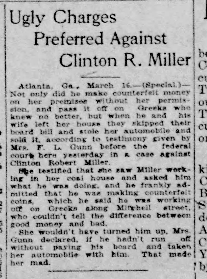[4] Newspapers.com – The Columbus Ledger – 17 Mar 1918 – Page 2; https://www.newspapers.com/clip/148720161/clinton-charged-with-counterfeit/?xid=637