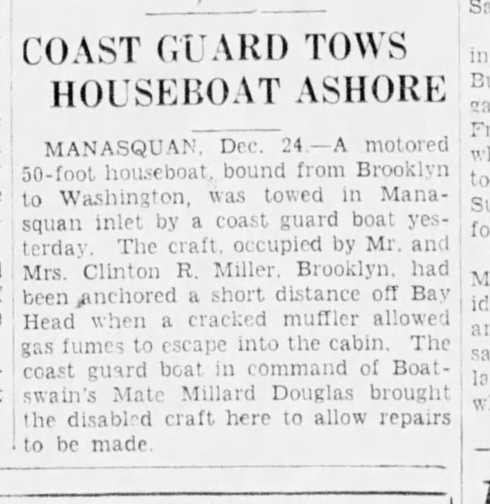 [14] Asbury Park Press, December 24, 1935, Page 1. “Coast Guard Tows Houseboat Ashore.” https://www.newspapers.com/clip/148766039/clinton-miller-houseboat-towed-ashore/?xid=637