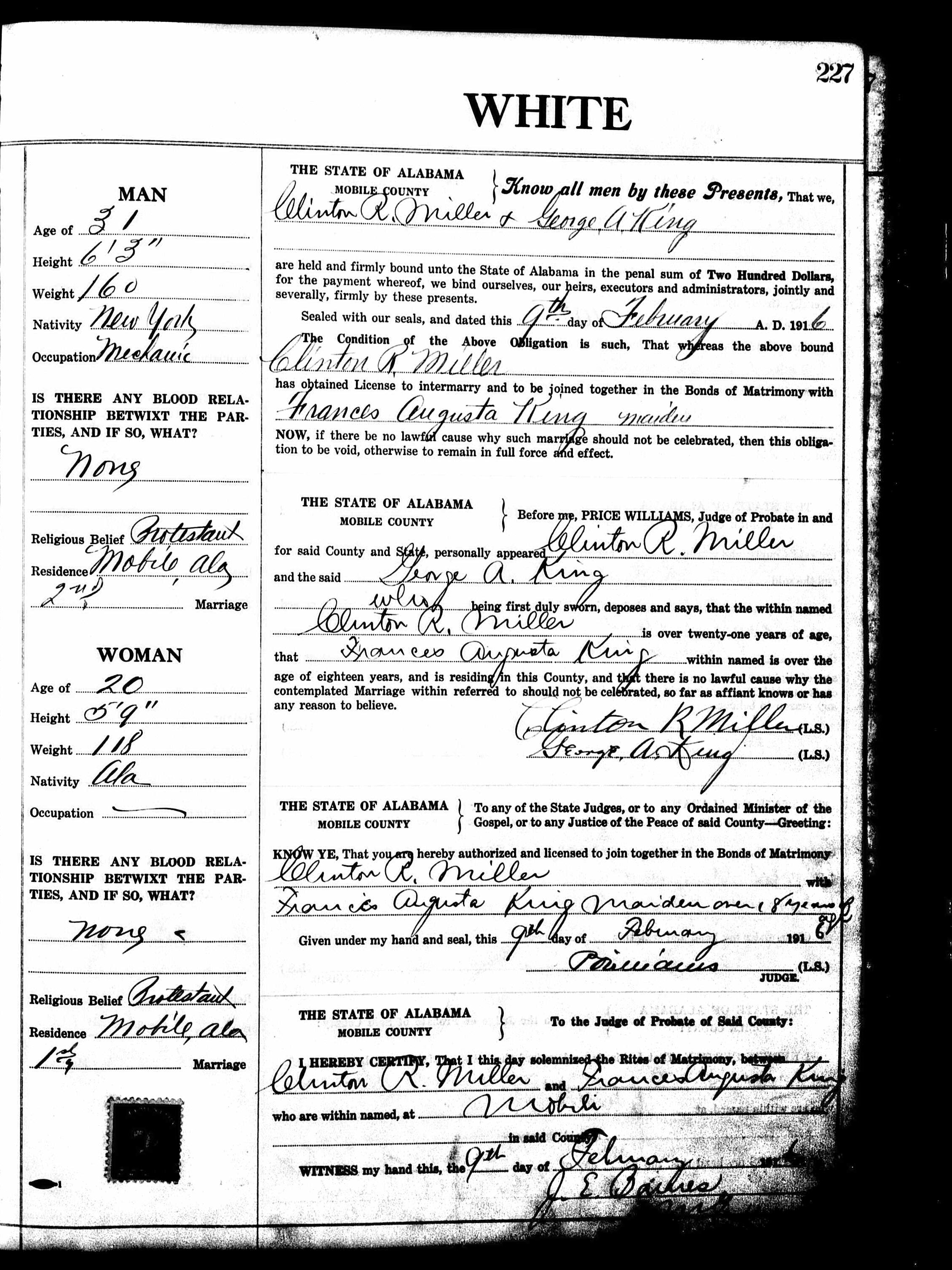 Clinton MILLER did not travel directly to Florida with his children and parents. In 1916, Clinton was living in Mobile, Alabama. He married 20-year-old Frances Augusta KING in February of that year.[3] Nine months later, in November of 1916, his new wife gave birth to a daughter – Frances Elizabeth MILLER.