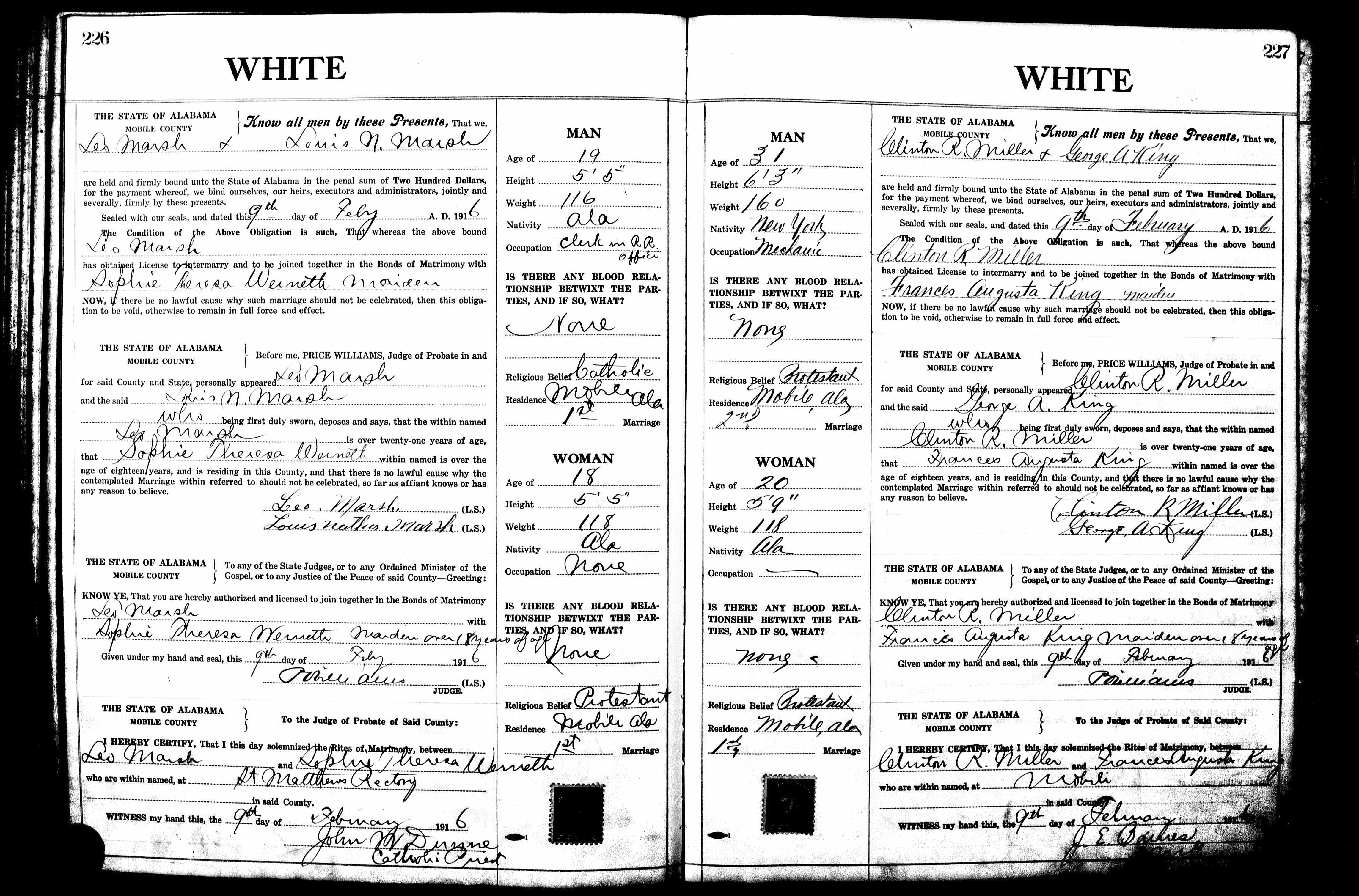 [3] Alabama, County Marriage Records, 1805-1967 Record. February 9, 1916.