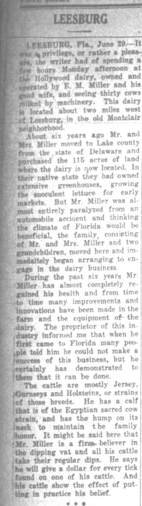 In 1915, The MILLER family – Manly, Lillian, Elma Mae and Edward – moved to Florida.[2] E. Manly MILLER had been severely injured in an automobile accident and the Florida air promised to be good for his health. Family legend says they took a boat from Delaware to Florida, but no port records have been found. The family purchased 115 acres in Lake County and opened Hollywood Dairy.