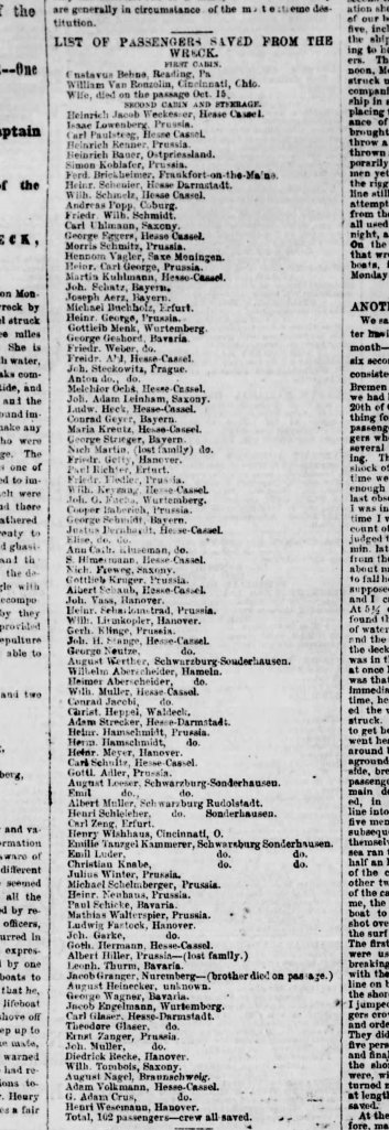 Baberich describes: “water rushing into the hold in a perfect torrent, and the breaking of the spray over the deck as she swayed to and fro in the heavy sea. The deck commenced breaking up rapidly, and portions of the cargo were forced up from the hold, tearing up the planks. Several of the passengers were crushed to death between barrels, casks and boxes, and were afterwards swept overboard by the waves in a horribly mutilated condition…. A terrible scene of excitement ensued on board among the passengers, some of whom clung to the sailors with a terrible tenacity, imploring them to save them. The sailors…got out the boats, determined to save their own lives. The passengers made a rush for the first boat when it was lowered, but the sailors stood before it with drawn knives and threatened to kill any who attempted to get into it.