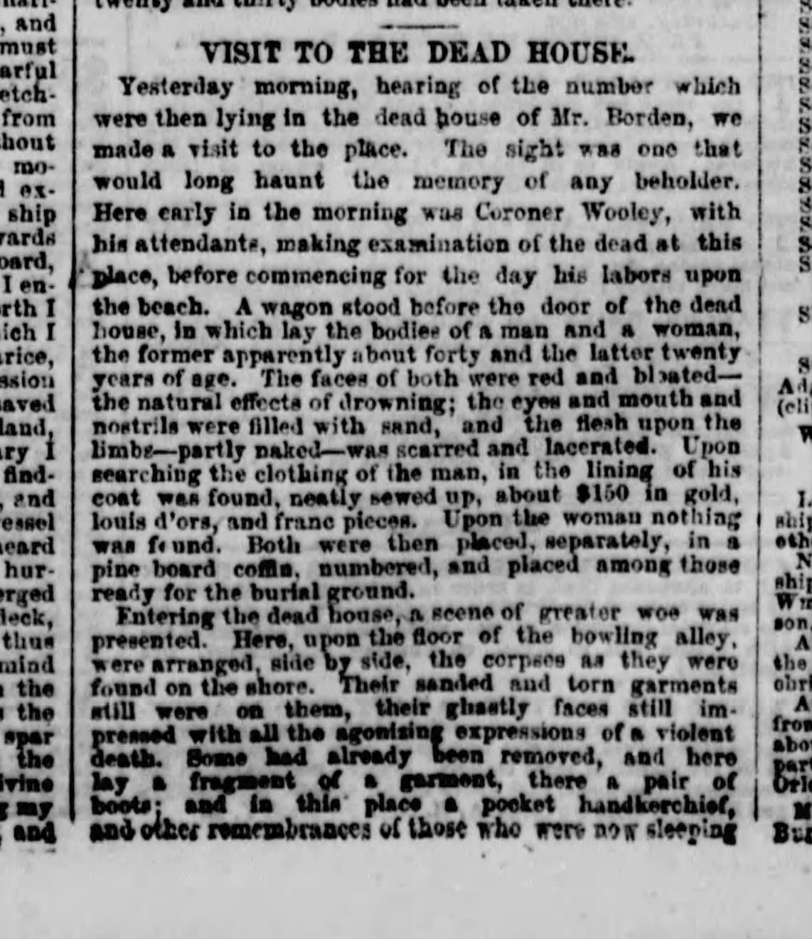 When the ship struck the passengers were alerted by the crew members to come on deck to be saved, but passenger Louisa Haeier noted that many did not speak English and were confused as to what was happening. Those that understood frantically tried to dress and grab anything of worth they had brought with them to America – gold, money, jewels – as they scrambled to the deck. Unfortunately, many were washed overboard, or crushed, when the boat struck the ocean floor, and the waves began to pummel the boat. After the shipwreck it was reported that the ship doctor had stolen jewels and money from passengers before making his attempted escape and drowning.