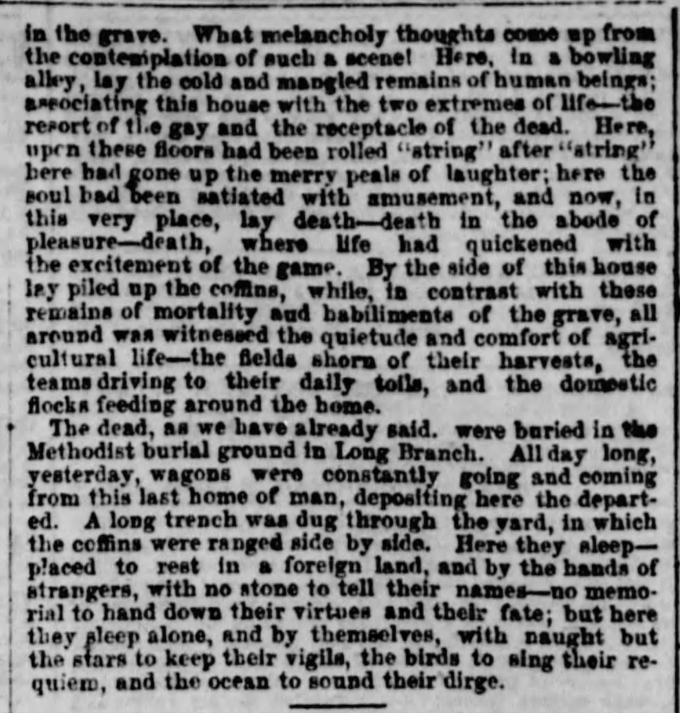 After over 24 hours they were finally reached by surfboat and rescued. Exhausted, battered, and stripped of all goods (and in many cases clothing), upon reaching the shore some perished from their trauma. The dead would continue to wash ashore for up to a year. Overall, the death count was as high as 280; around 140 were buried in a mass grave at the Old First United Methodist Church in West Long Branch, New Jersey.[10]